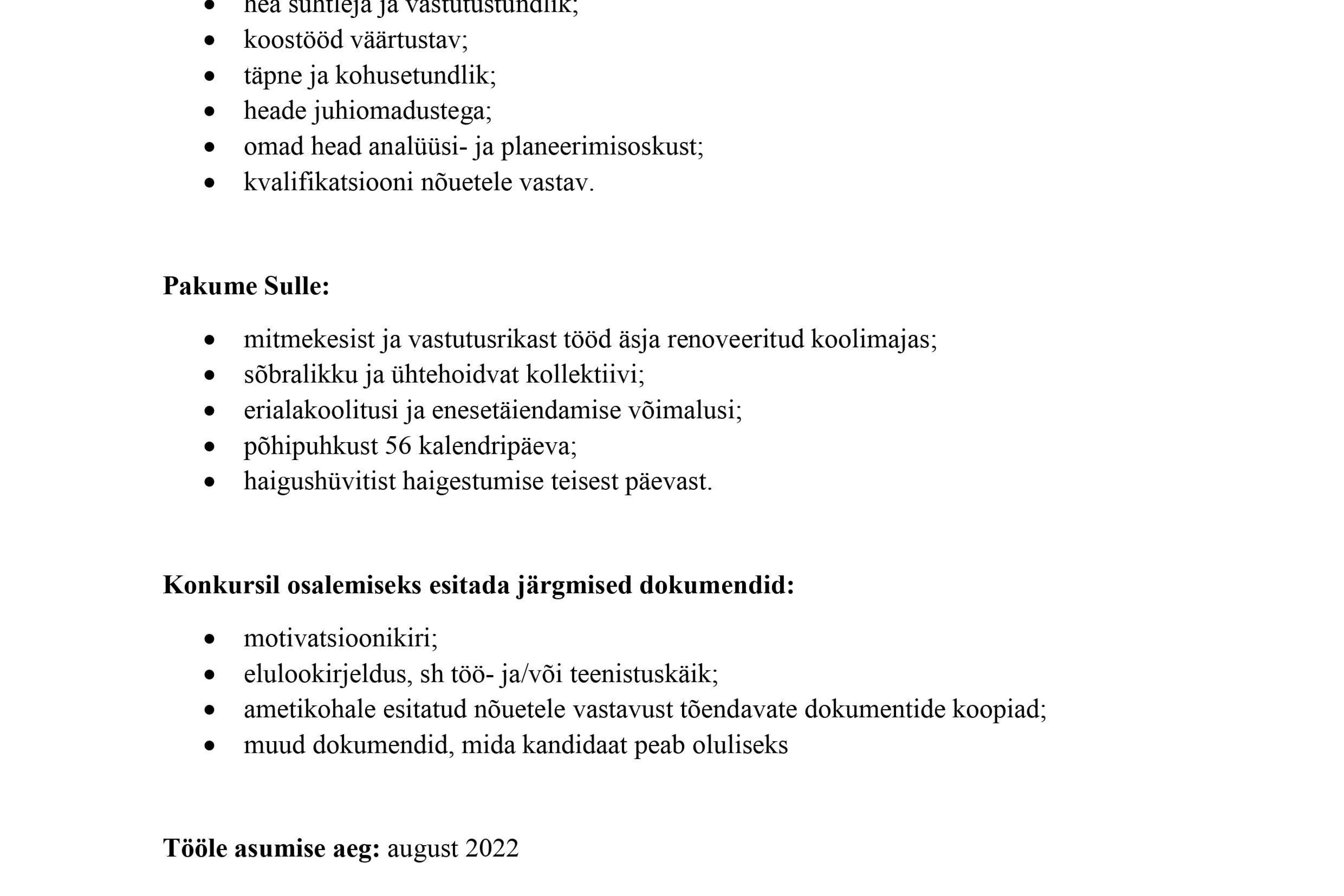 Tööle asumise aeg: august 2022