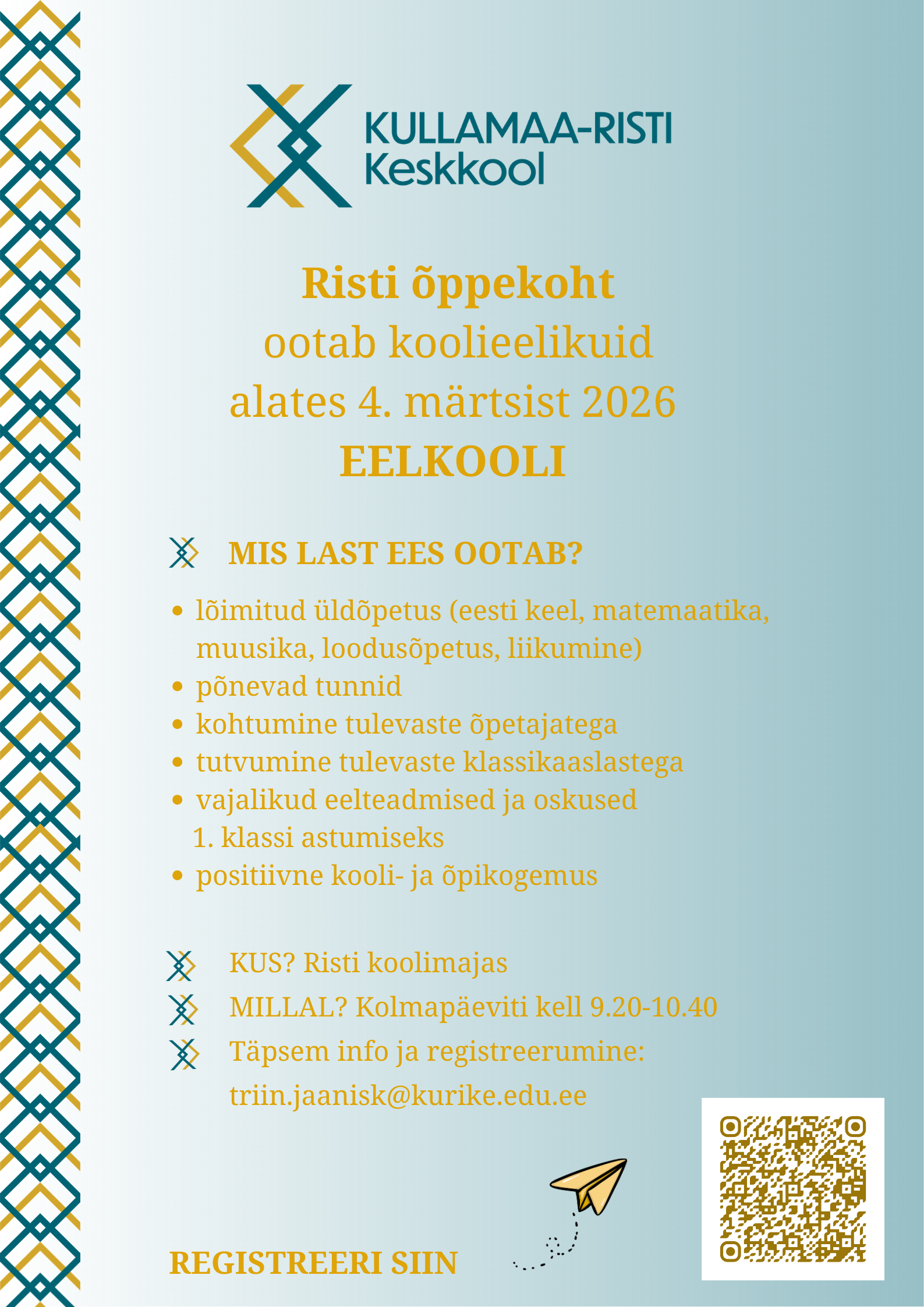 Kullamaa-Risti Keskkooli Risti õppekoht ootab koolieelikuid EELKOOLI alates 4. märtsist 2026.